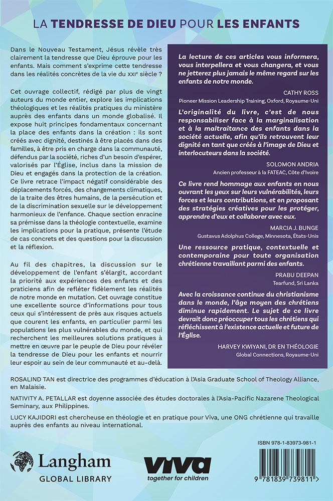 Cet ouvrage collectif, rédigé par plus de vingt auteurs du monde entier, explore les implications théologiques et les réalités pratiques du ministère auprès des enfants dans un monde globalisé. Il expose huit principes fondamentaux concernant la place des enfants dans la création : ils sont créés avec dignité, destinés à être placés dans des familles, à être pris en charge dans la communauté, défendus par la société, riches d’un besoin d’espérer, valorisés par l’Église, inclus dans la mission de Dieu et engagés dans la protection de la création. Ce livre retrace l’impact négatif considérable des déplacements forcés, des changements climatiques, de la traite des êtres humains, de la persécution et de la discrimination sexuelle sur le développement harmonieux de l’enfance. Chaque section enracine sa prémisse dans la théologie contextuelle, examine les implications pour la pratique, présente l’étude de cas concrets et des questions pour la discussion et la réflexion.