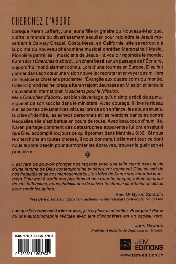 Dans cet ouvrage, vous découvrirez qui est Karen Lafferty, celle qui a écrit le chant connu dans le monde entier „Cherchez d’abord le royaume de Dieu“ . Elle y révèle avec courage et sincérité les blessures de son passé, mais surtout, elle montre comment, à travers chaque épreuve, Dieu est resté fidèle à sa promesse de Matthieu 6:33.