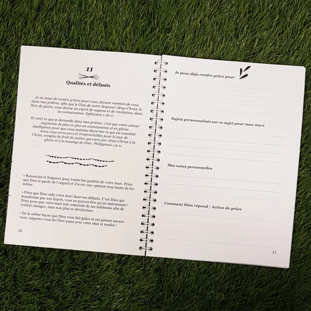 Prier régulièrement pour son mari est une autre façon de l’aimer et de vouloir ce que Dieu veut pour lui. Ce journal se veut être un outil pratique pour vous aider à être plus intentionnelle dans vos prières pour votre conjoint. Les sujets proposés permettent d’avoir des thèmes plus variés et d’enrichir votre vie de prière. Les sujets sont toujours accompagnés de versets afin de méditer et prier selon la Bible. Et la cerise sur le gâteau : vous pouvez personnaliser les sujets de prières proposés, en fonction de votre cher et tendre…