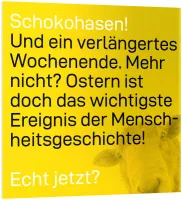 "Schokohasen! Und ein verlängertes Wochenende. Mehr nicht? Ostern ist doch das wichtigste Ereignis der Menschheitsgeschichte! - Echt jetzt?"