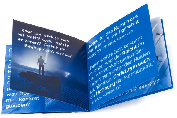Ein kleines, aber hochwertiges und ansprechend gestaltetes Give-Away im handlichen Format. Mit kurzem, direkten Text und klare Botschaft gerade für Lesemuffel. Sehr gut geeignet für Verteileinsätze, momentan z. B. zum Briefkasten-Jogging.