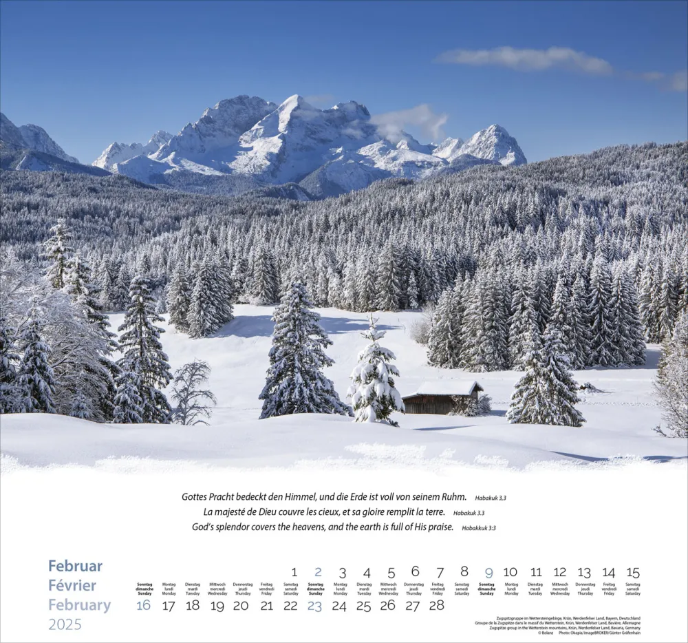 Wandkalender mit Bibelversen in deutscher, englischer und französischer Sprache. - Dieser grossformatige Bildkalender zeigt in wundervollen Aufnahmen die stille und erhabene Schönheit der Bergwelt. 13 Aufnahmen aus der Schweiz, aus Frankreich und aus Italien, die Gottes Schöpfung preisen, werden von passenden Bibelversen in drei Sprachen unterstrichen.