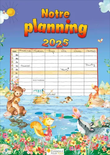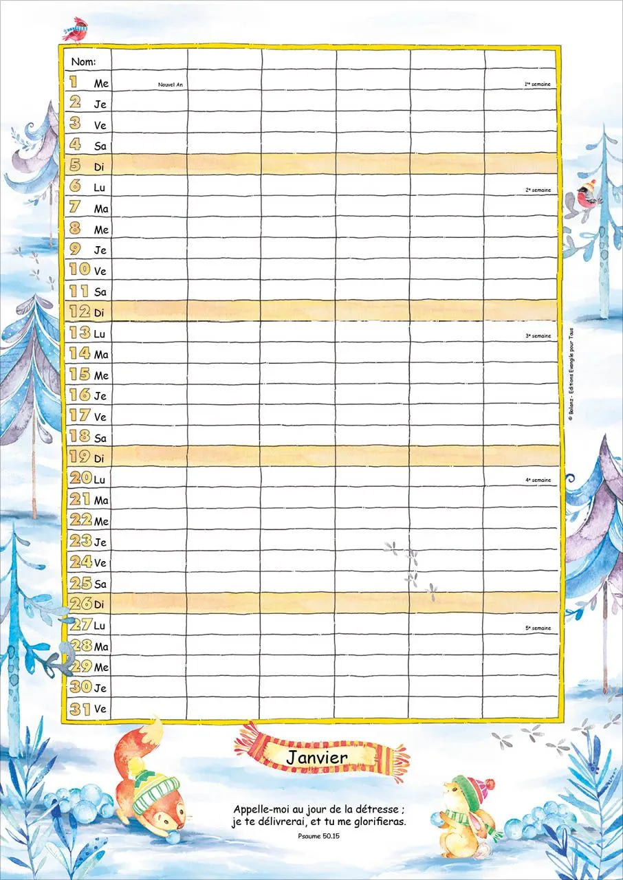 Avec des dessins colorées 12 feuilles de planning à 6 colonnes entourées de dessins amusants, avec beaucoup de place pour le planning de toute la famille; avec versets bibliques appropriées et spirale.