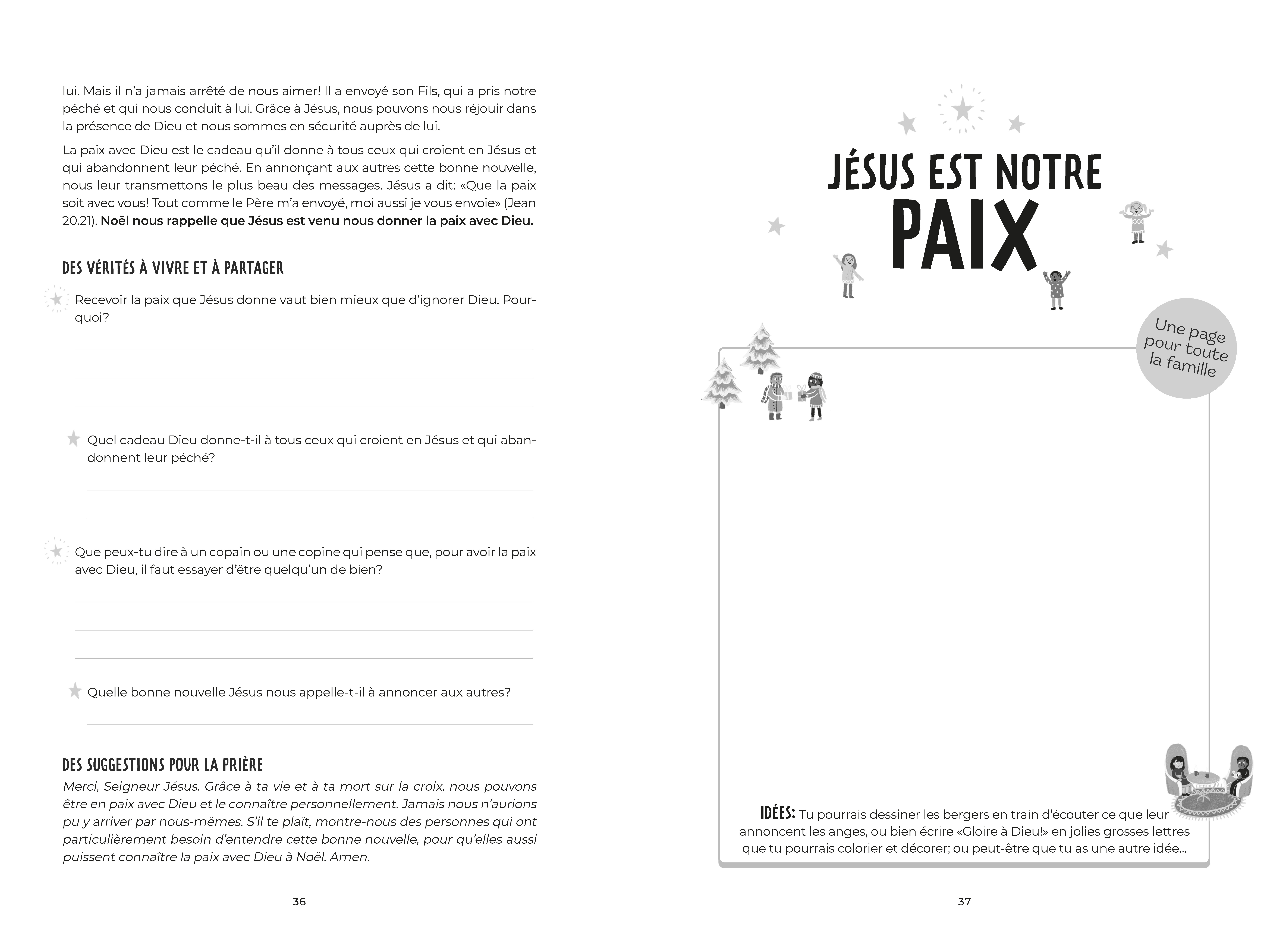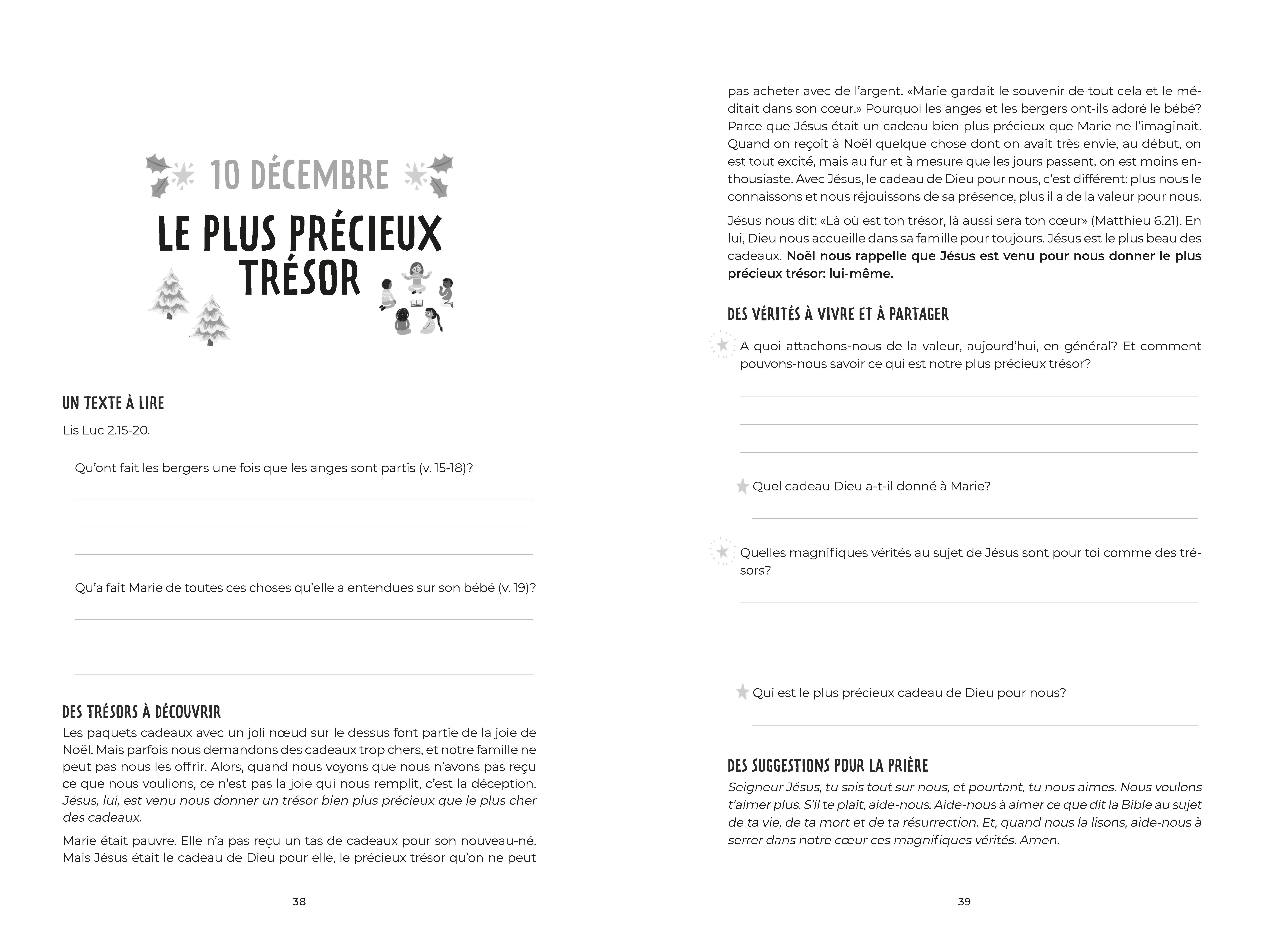 Chacune des 25 méditations est constituée de quatre parties – Un texte à lire, Des trésors à découvrir, Des vérités à vivre et à partager, Des suggestions pour la prière – et se termine par une page spéciale qui rappelle des vérités essentielles au sujet de Jésus et propose aux jeunes lecteurs un espace pour écrire, décorer ou dessiner.