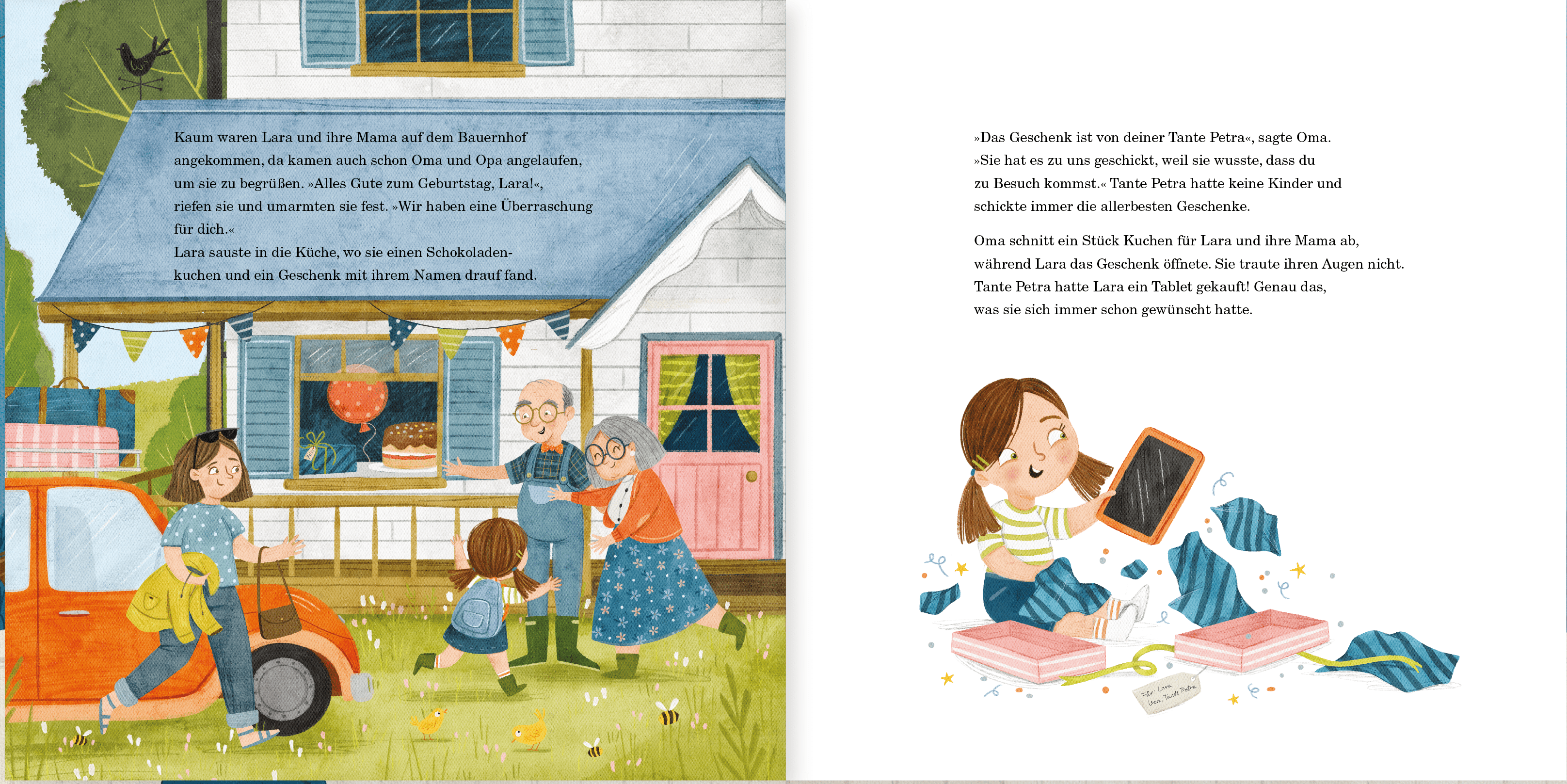 Lara kann den Sommer kaum abwarten, denn dann darf sie wie jedes Jahr Oma und Opa auf dem Bauernhof besuchen. Sie freut sich auf ihre Grosseltern, die Tiere, das Mitarbeiten in der Scheune und das Spielen mit Cousin Robin und Cousine Pia. Doch dann bekommt Lara ein neues Tablet geschenkt. Obwohl sie sich so lange auf die Zeit auf dem Bauernhof gefreut hat, verbringt sie plötzlich den grössten Teil des Tages allein am Bildschirm.